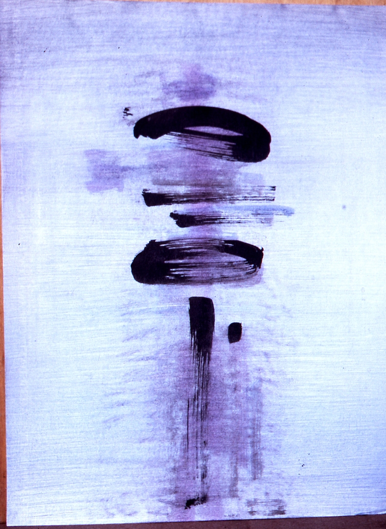 Description de l'oeuvre :Signe calligraphique anthracite et violet sur fond bleu.