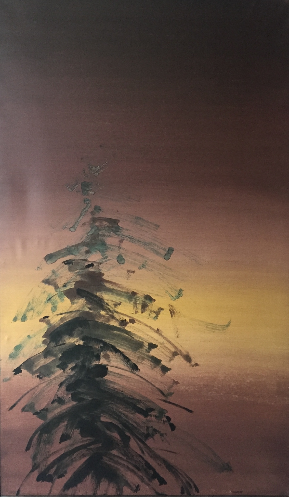 Fond aubergine, bande jaune au centre. Sapin à gauche noir, vert et aubergine.