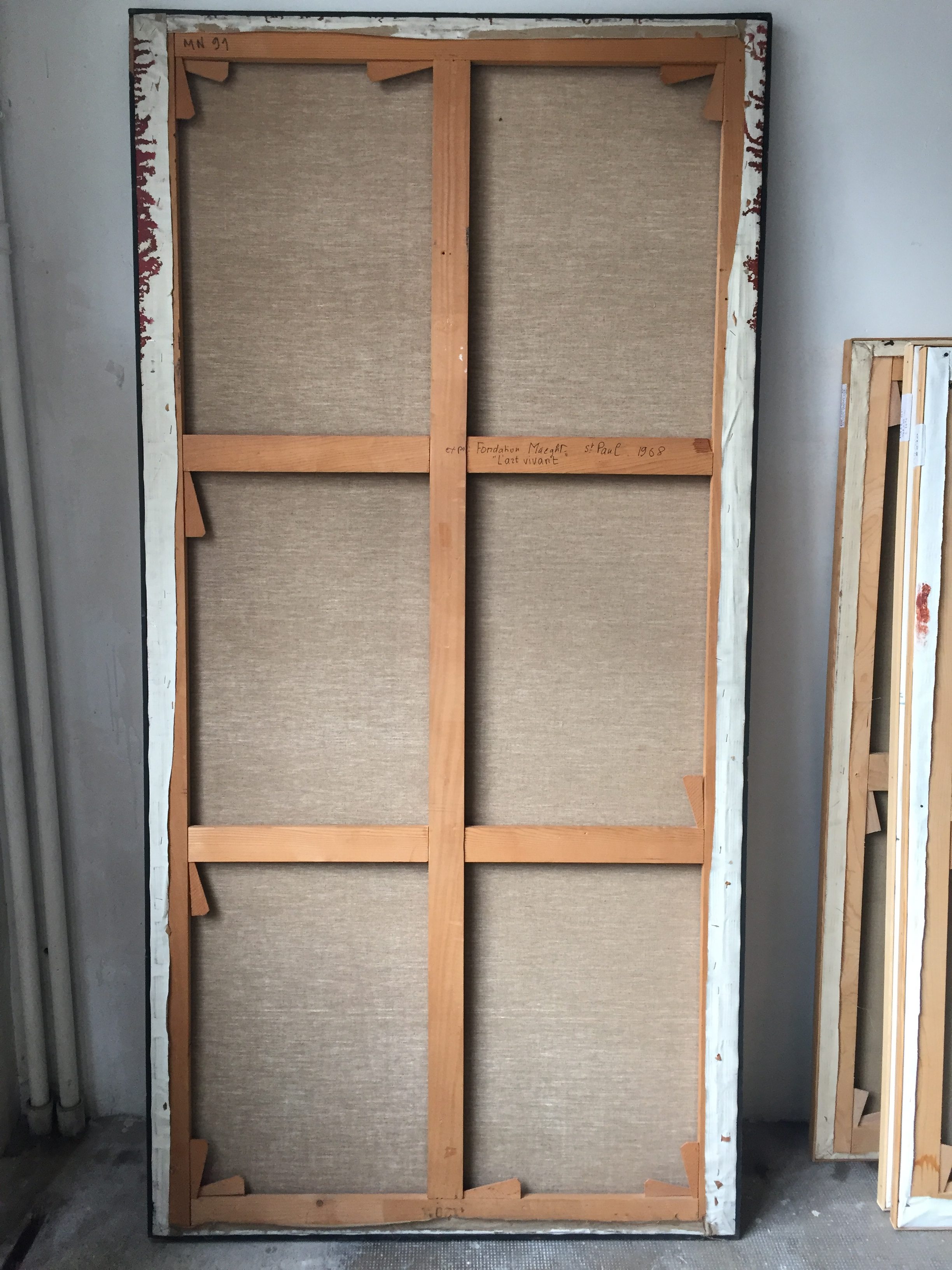 étiquette sur le côté : “MN91.ht. 120M = 195 x 97. 1968 “l’art vivant” fondation Maeght Evenos. Mer rouge. Eraflures”