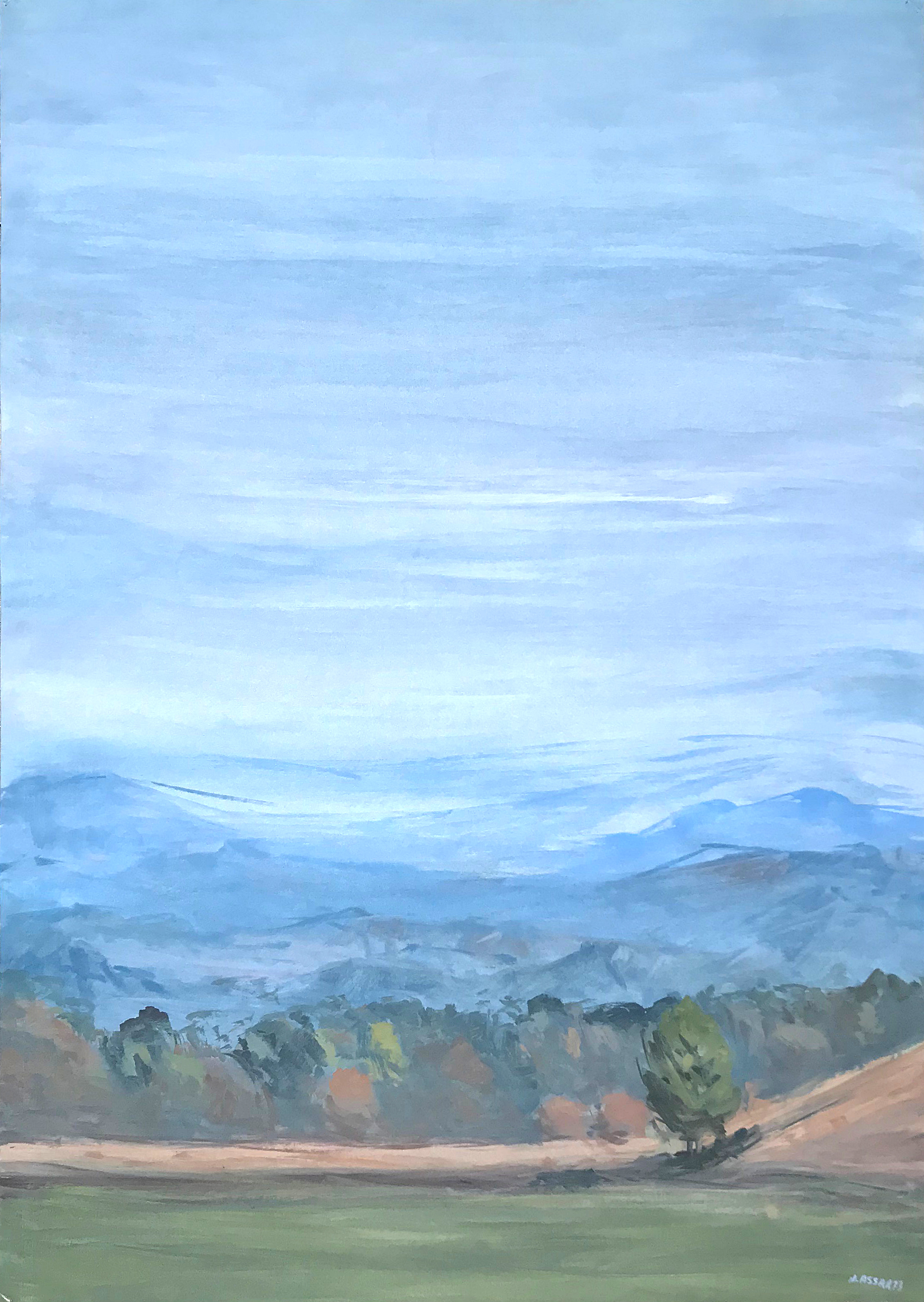 Description of the work :Immense ciel bleu sur les trois-quart supérieurs. Pré vert, labours, rangée d’arbres à l’automne, montagnes bleues sur le quart en bas.