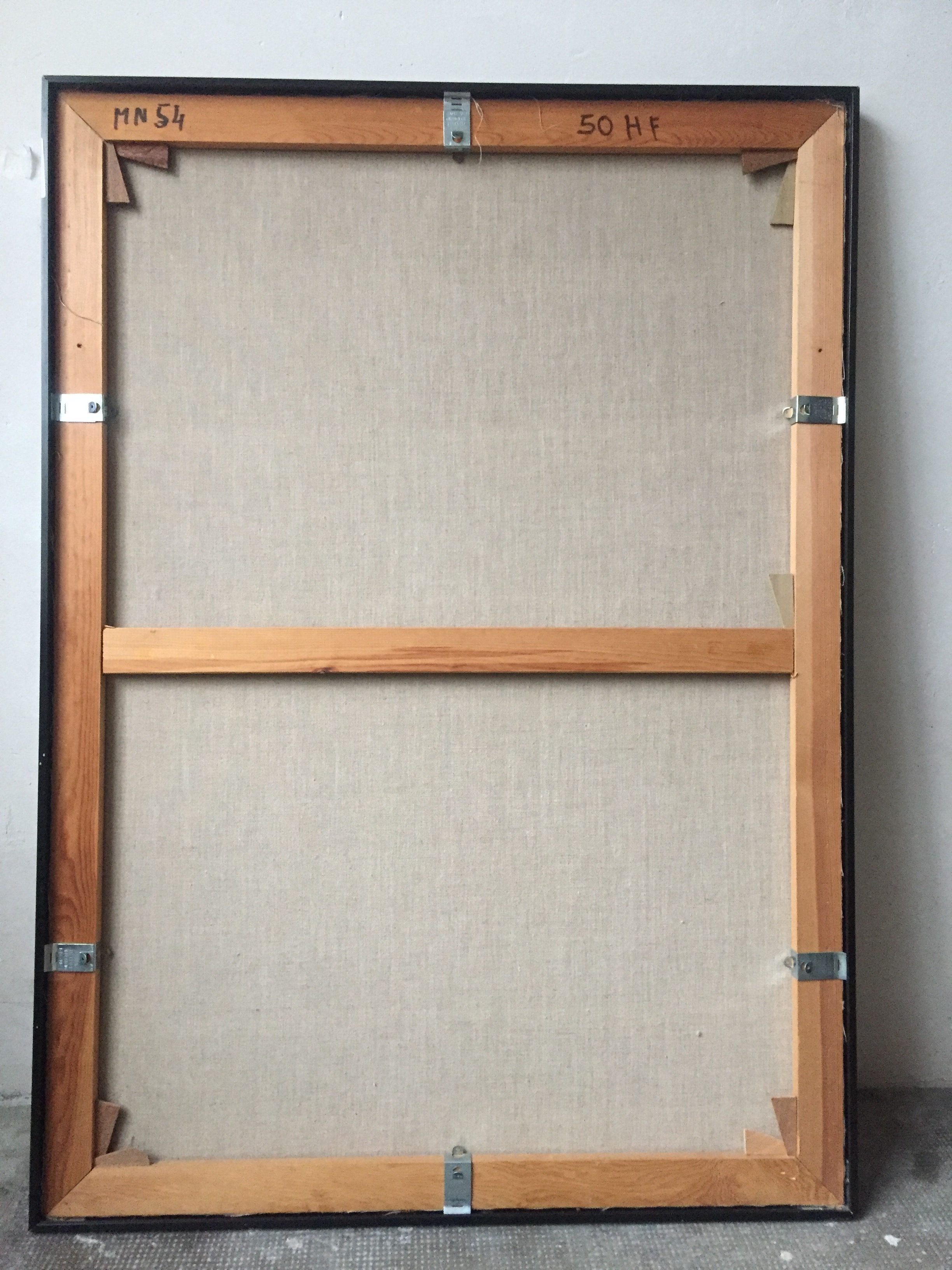 étiquette sur le côté : « 105 x 75 Huile sur papier marouflé 1977 »