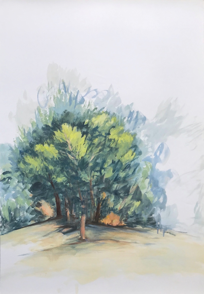 Description of the work :Fond blanc laissé en réserve. Arbres sur une butte. Troncs marron. Feuillage vert tendre et vert foncé. Quelques buissons ocre. Touches dynamiques bleues tout autour.