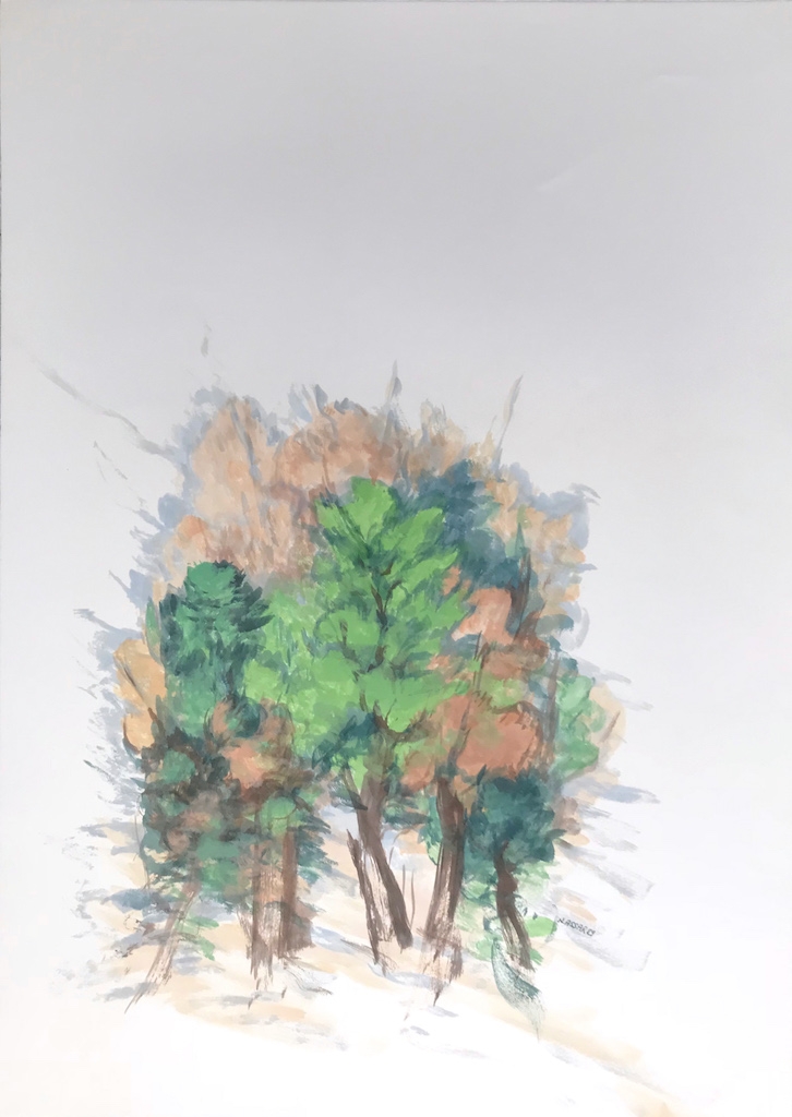 Description de l'oeuvre :Fond blanc laissé en réserve. Arbre vert tendre au centre entouré d’arbres rose et verts. Sol rose et bleu.
