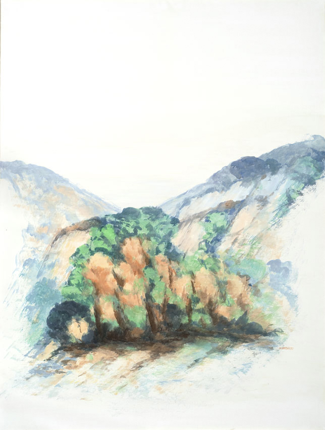 Fond blanc. Cimes bleues. Rideau d’arbres jaunes et verts.