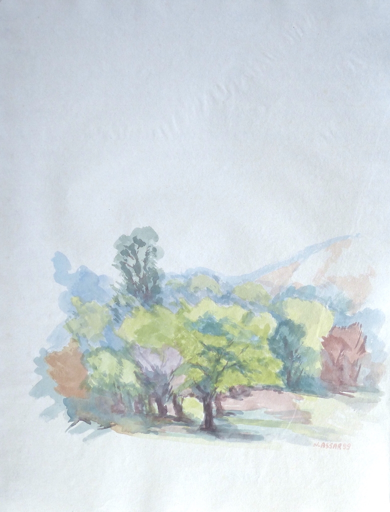 Description de l'oeuvre :Automne. À gauche, quelques cerisiers jaunes encore enfeuillés ; un pin noir sommet vert-bronze. À droite, friche, cognassier et yeuses. Au loin, pan de roche claire traversé de rose et de bleu. Ciel et fond en blanc de réserve.