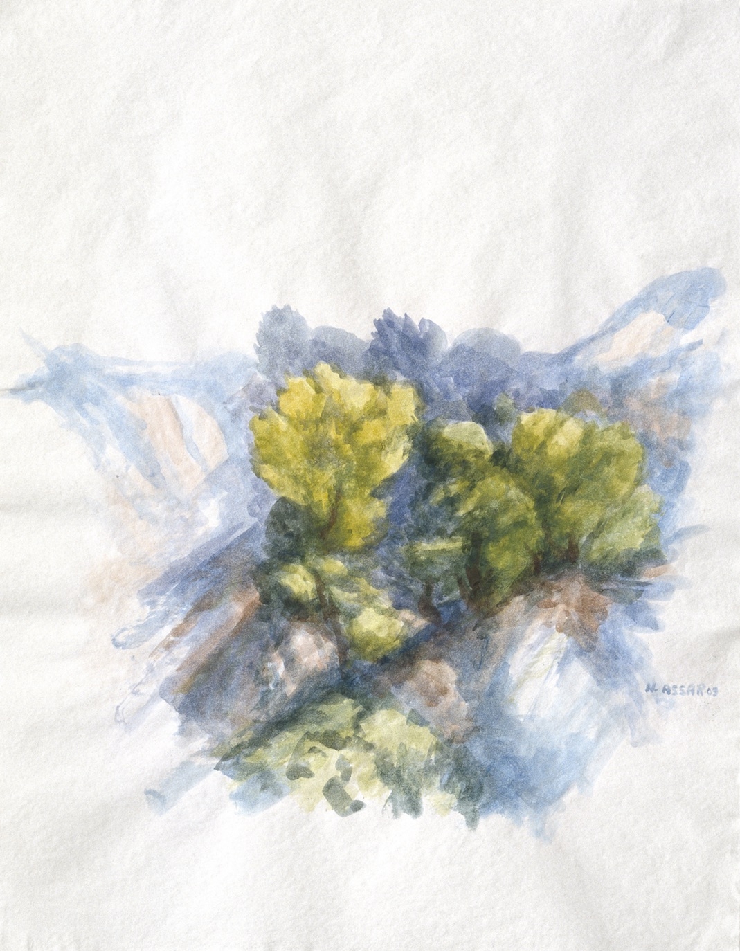 Description de l'oeuvre :Automne. Combe sur la route de Blauvac. Versants de safre clair. Peupliers jaunes. Fond en blanc de réserve.